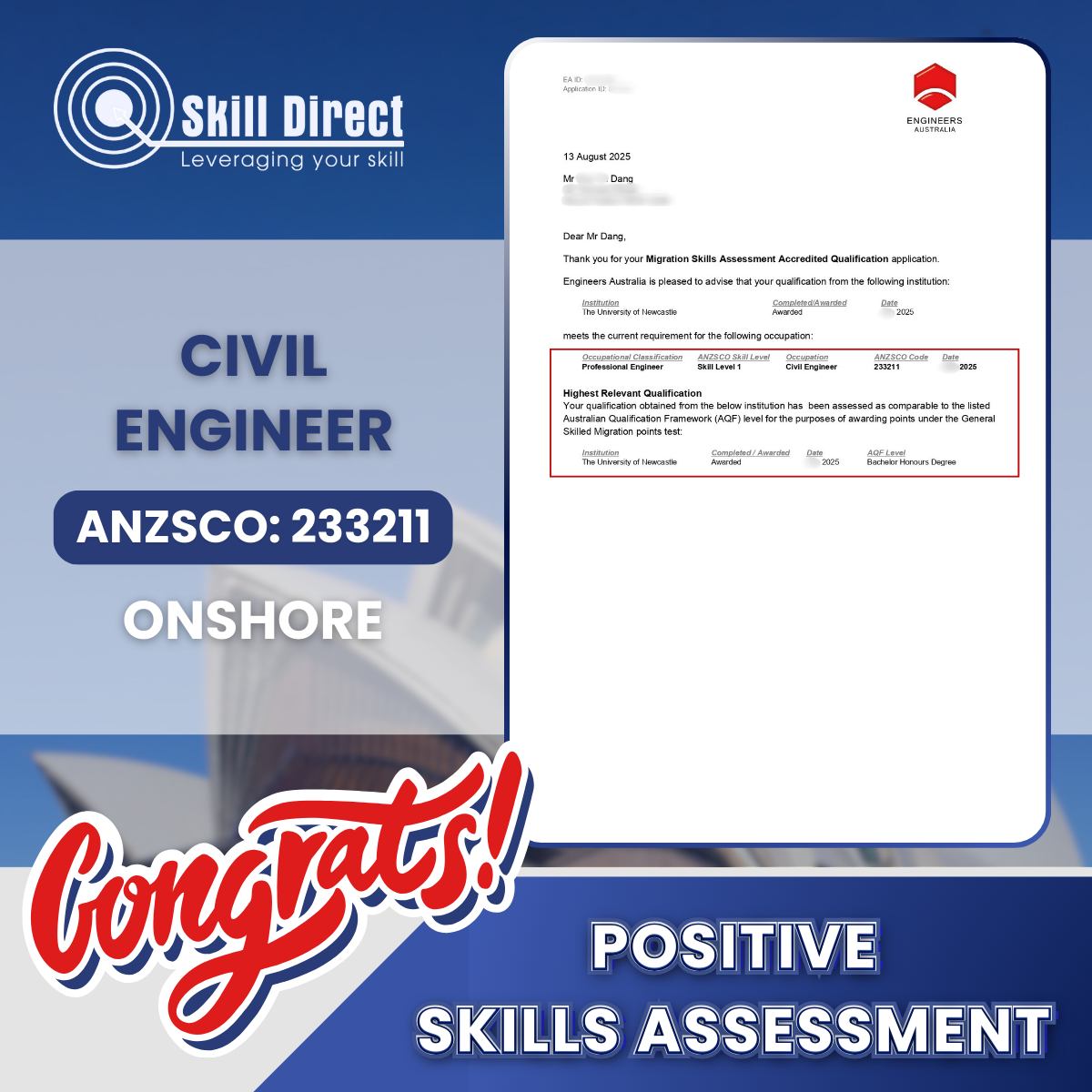 A positive Skills Assessment is the first step in your journey as a skilled migrant. Thus, we analyze our client’s profiles and provide the best possible pathways.