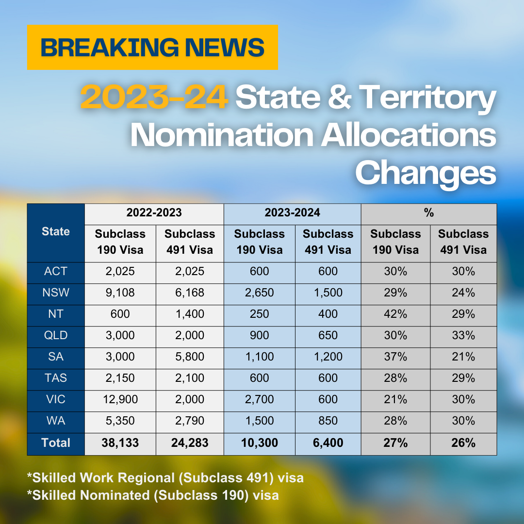 By comparing between the nomination allocations for fiscal year 2022 – 2023 and 2023 – 2024, it is observed that the total state nomination allocations for subclass 190 and 491 in the 2023-2024 have decreased by about 73% compared to last year, 62416 quotas for 2022 – 2023 while just only 16700 places are allocated for this financial year.